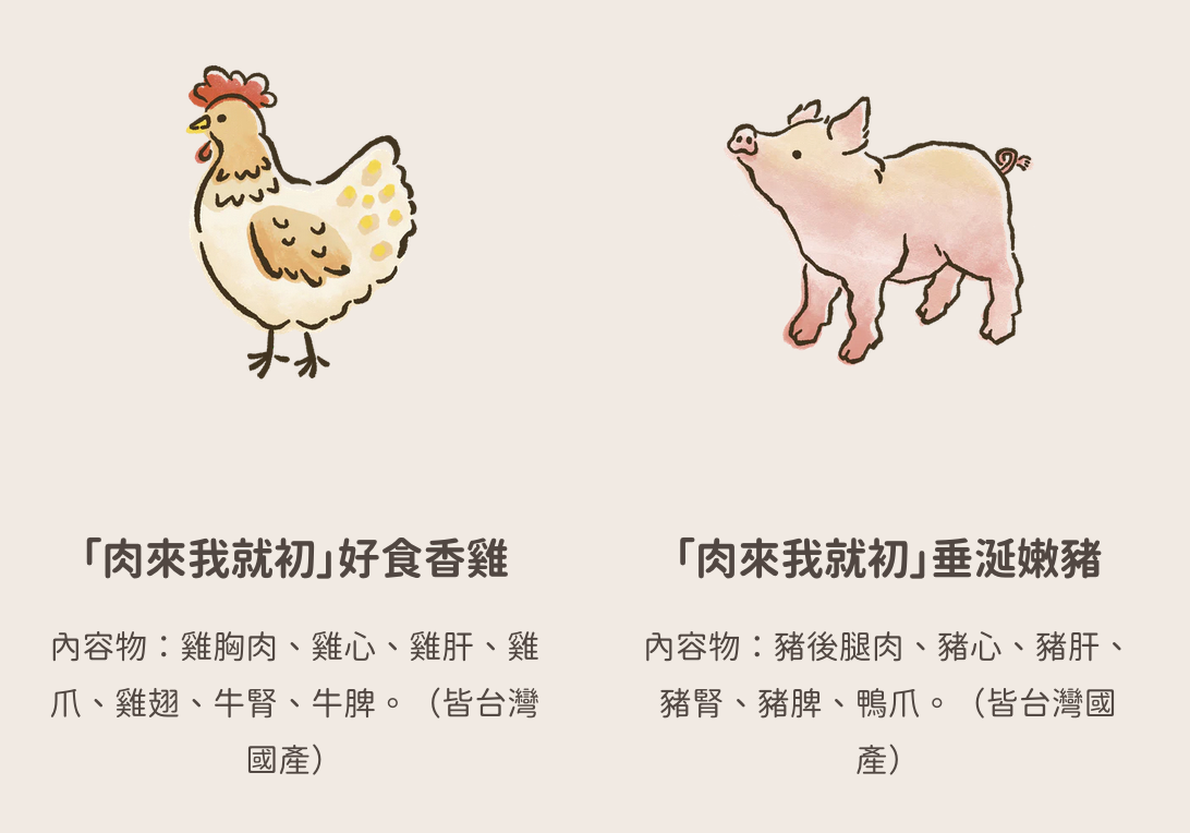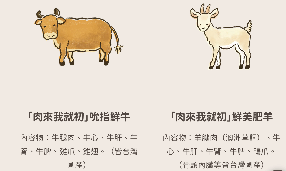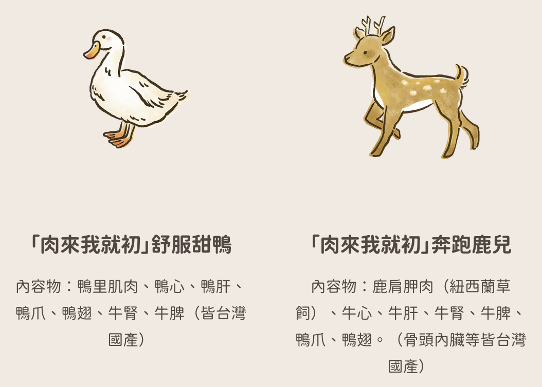 雞, 豬, 鴨, 牛, 羊, 鹿, 生食營養粉(牛羊鹿口味), 生食營養粉(雞鴨豬口味), 鵪鶉(90g 整隻), 鵪鶉(90g 切塊)