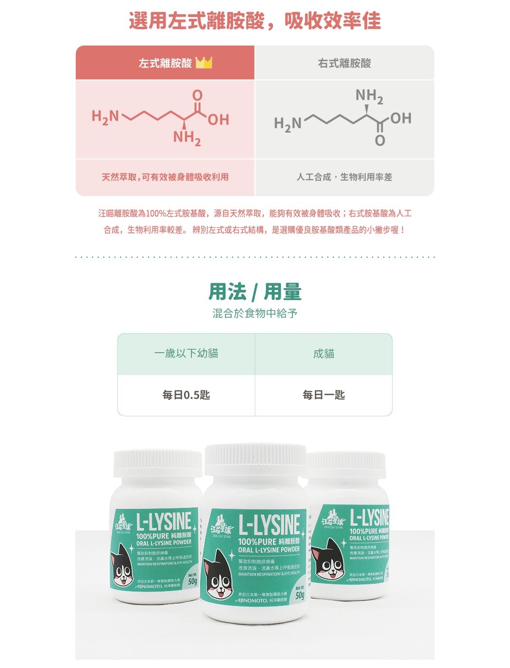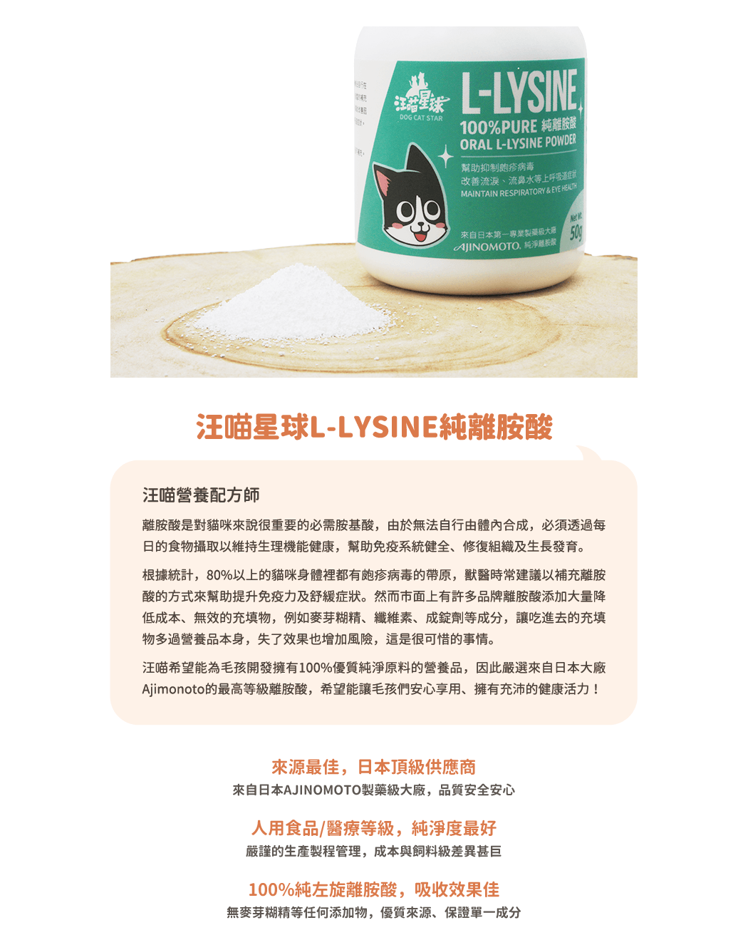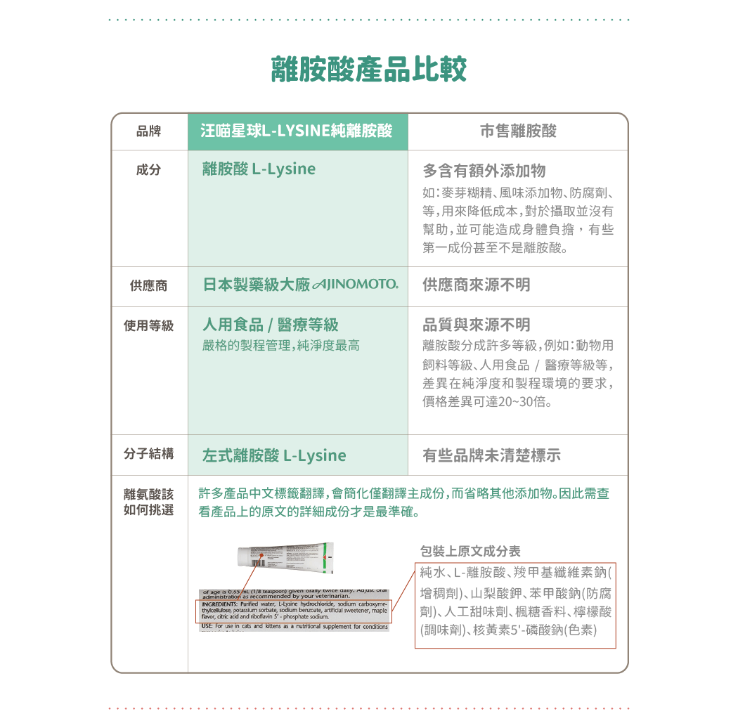 • 適合有流淚、鼻孔黑黑的貓咪補充 • 幫助維持呼吸道健康 • 100%日本製藥大廠 Ajinomoto 純淨離胺酸 • 人用食品級,純淨度最高